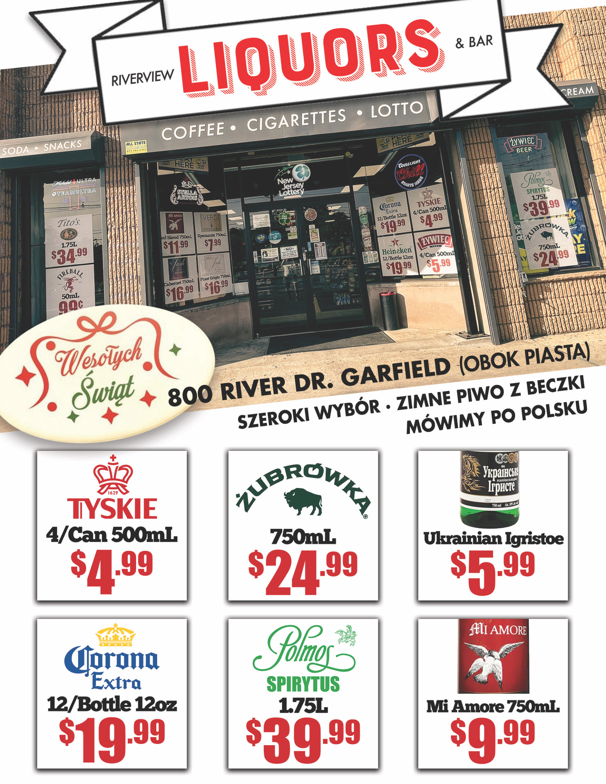 Conveniently located in the Riverview Mall at 800 River Dr. in Garfield NJ, we have a wide selection of beer, wine, and spirits, including rare imported Italian and Polish specialties. Enjoy a drink at our bar with 6 different draft beers as well as shots and mixed drinks. Also THC seltzers, cigarettes, lottery, soft drinks, ice, candy, snacks, and the best fresh ground coffee in Garfield! Cash ATM on the premises.